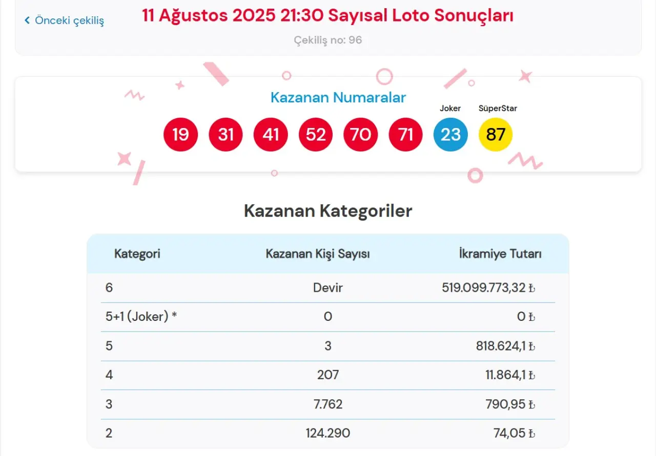 11 Ağustos 2025 Pazartesi Çılgın Sayısal Loto Çekiliş Sonuçları