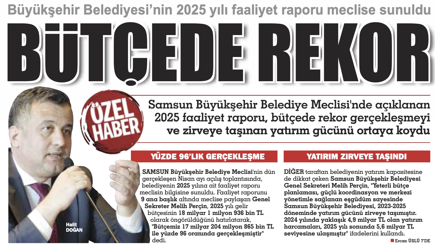 Samsun Büyükşehir bütçesinde rekor açıklandı. Samsun Büyükşehir Belediye Meclisinde sunulan 2025 faaliyet raporu, bütçede rekor gerçekleşmeyi ve zirveye taşınan yatırım gücünü ortaya koydu. Kentin vizyon projelerine ayrılan payın büyüklüğü, meclis üyeleri tarafından değerlendirildi.