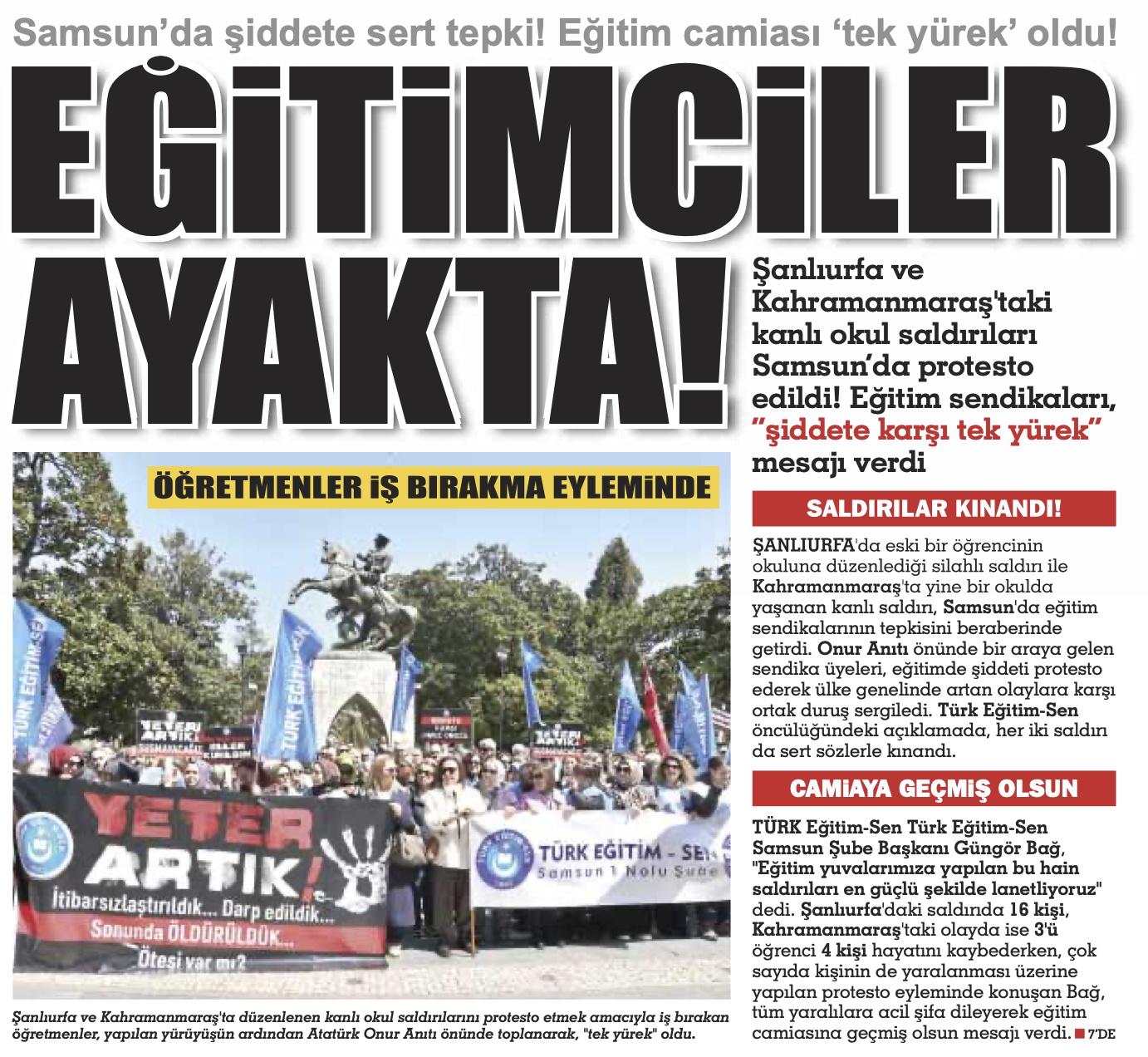 Şanlıurfa ve Kahramanmaraş'taki kanlı okul saldırıları Samsun’da protesto edildi. Eğitim sendikaları, “şiddete karşı tek yürek” mesajı vererek saldırılarda hayatını kaybedenler için taziye dileklerini iletti.