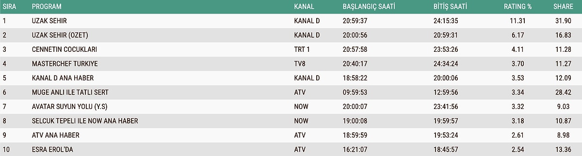 15 Aralık Pazartesi akşamı yayınlanan dizilerin reyting sonuçları açıklandı. Kanal D’nin sevilen dizisi Uzak Şehir, Cihan ve Alya’nın ilk yakınlaşma sahneleriyle büyük heyecan yaratmasına rağmen Total ve ABC1 reytinglerinde düşüş yaşadı. Dizinin reytingleri Total’de 16.02, AB’de 11.31, ABC1’de ise 14.70 olarak kaydedildi.