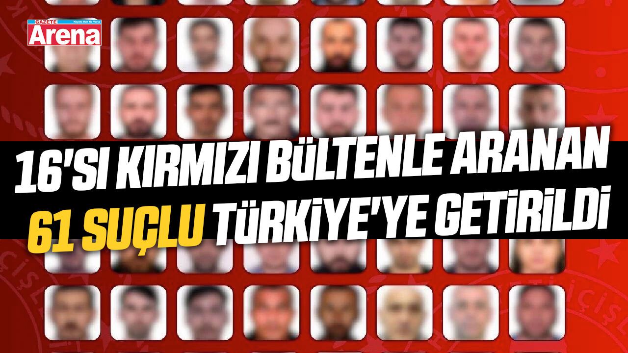 İçişleri Bakanlığı, kırmızı bültenle aranan 16, ulusal seviyede aranan 45 suçlunun ülkeye geri getirildiğini bildirdi. Bakanlıktan yapılan açıklamada, Emniyet Genel Müdürlüğü Interpol-Europol Daire Başkanlığı ve Adalet Bakanlığı görevlileri ile ilgili birimlerin koordinasyonunda, yurt dışına kaçan ve haklarında arama kararı bulunan kişilere yönelik ilgili ülkelerin kolluk birimleriyle ortak çalışma yürütüldüğü belirtildi.