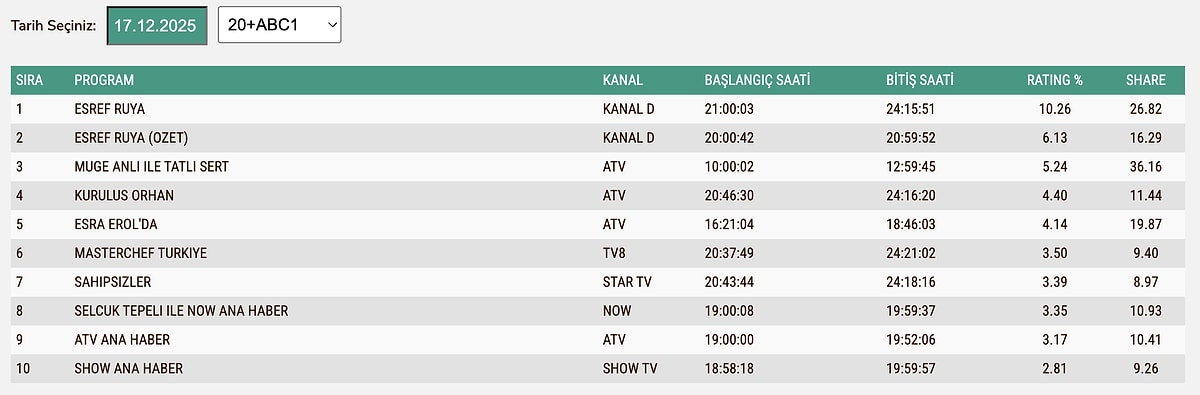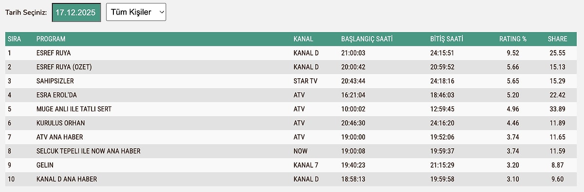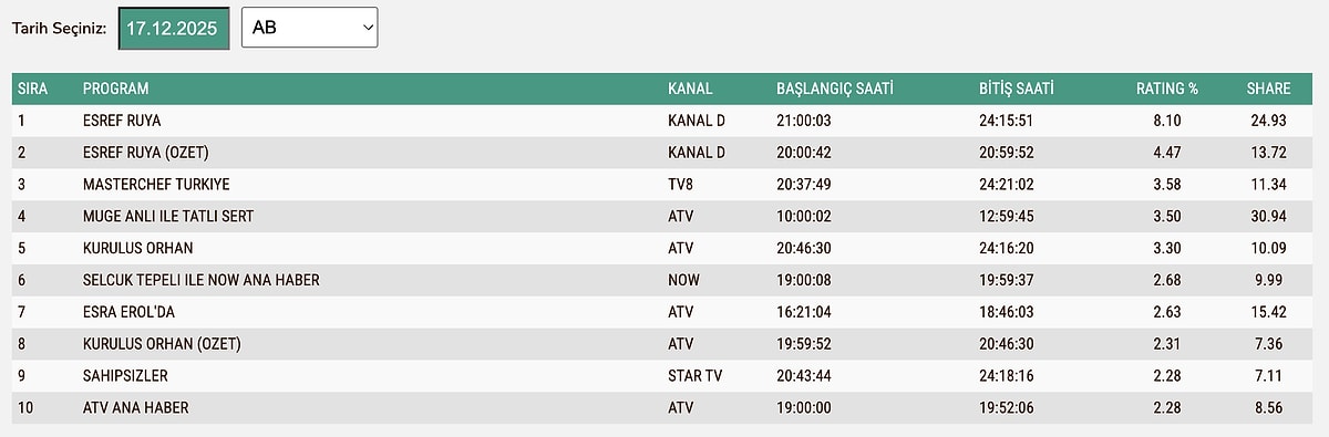 17 ARALIK ÇARŞAMBA TOTAL REYTİNG SONUÇLARI