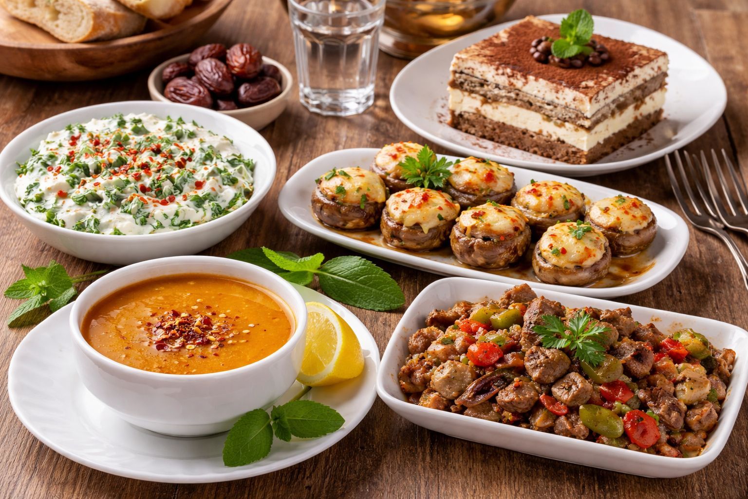 Ramazan sofralarına özel pratik ve lezzetli tarifler haberimizde. Menüde başlangıç olarak Ezogelin çorbası, ara sıcak ve salata seçenekleri arasında yoğurtlu semizotu salatası ve kaşarlı mantar yer alıyor. Ana yemek olarak et sote, tatlı olarak ise tiramisu tercih edilebilecek. Bu dengeli menü, hem lezzeti hem de sunumuyla dikkat çekiyor.