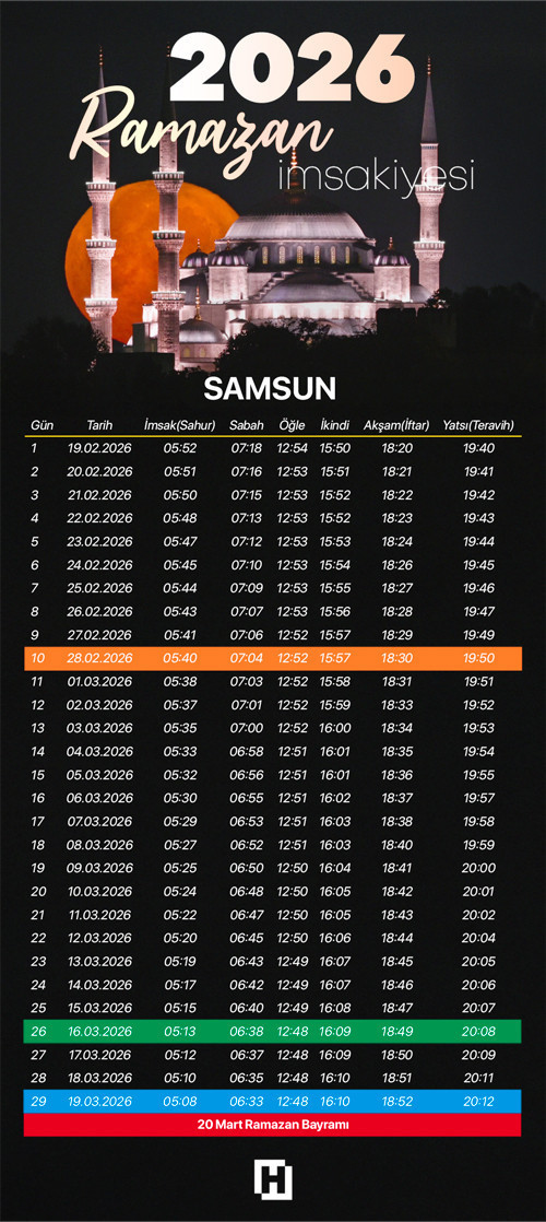 19-28 Şubat 2026 tarihlerini kapsayan ilk 10 gün için Samsun’da imsak vakti 05.52’den başlayarak kademeli şekilde 05.40’a kadar geriliyor. Aynı dönemde iftar vakti ise 18.20’den 18.30’a kadar ilerliyor.