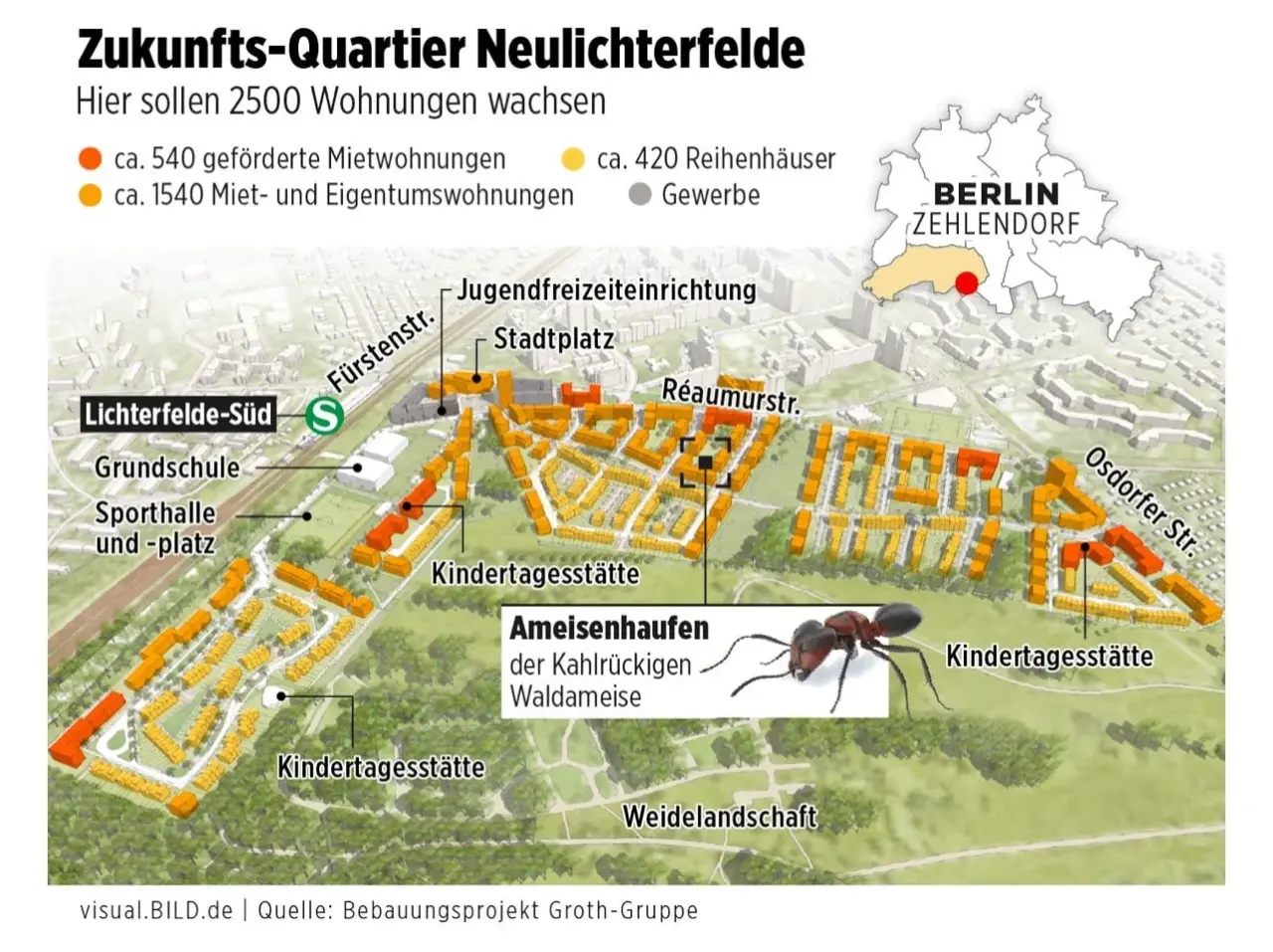 Berlin’in Neulichterfelde semtinde planlanan konut projesi, daha önce 993 kum kertenkelesi nedeniyle 5 yıl boyunca ertelenmişti. Şimdi ise kırmızı orman karıncaları inşaatın önünde yeni bir engel oldu.