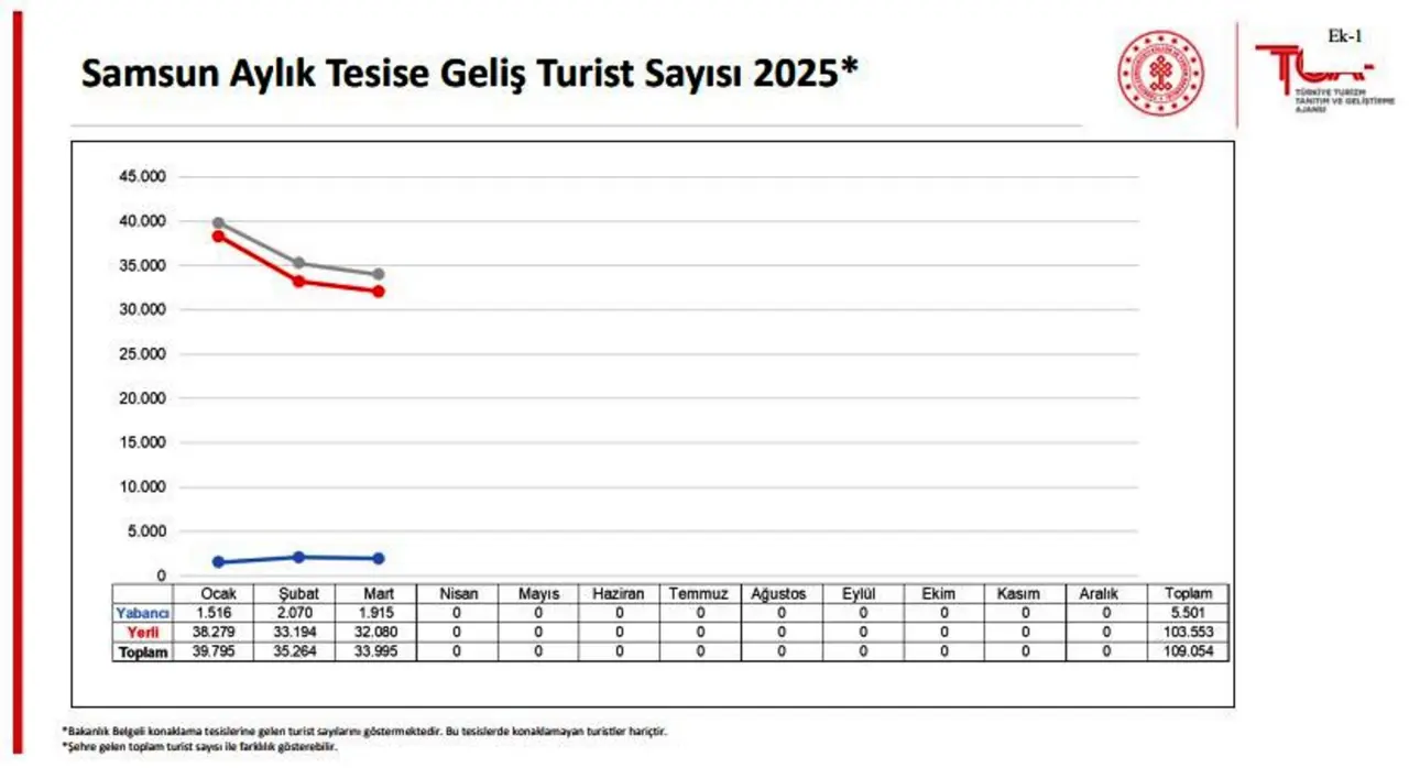 Türkiye Turizm, Tanıtım ve Geliştirme Ajansı (TGA) verilerine göre Samsun, 2025'in ocak, şubat ve mart aylarında toplamda 109 bin 54 turiste ev sahipliği yaptı. Bu turistlerin 5 bin 501’i yabancı, 103 bin 553’ü ise yerli ziyaretçilerden oluştu.