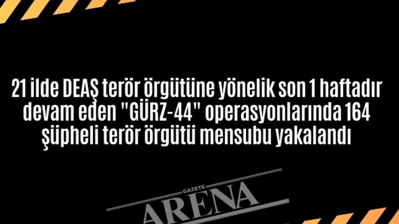 Bakan Yerlikaya sosyal medya hesabından yaptığı açıklamada, 21 ilde DEAŞ terör örgütüne yönelik son 1 haftadır devam eden "GÜRZ-44" operasyonlarında 164 şüpheli terör örgütü mensubunun yakalandığını belirterek şu bilgileri verdi:
