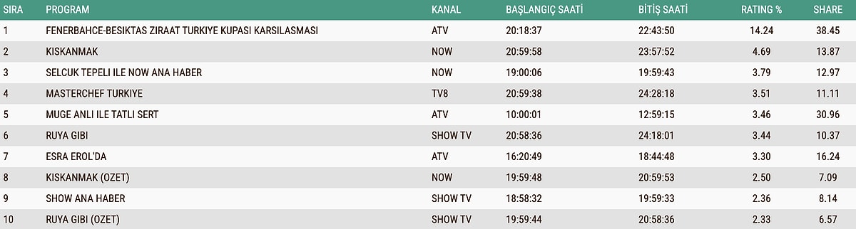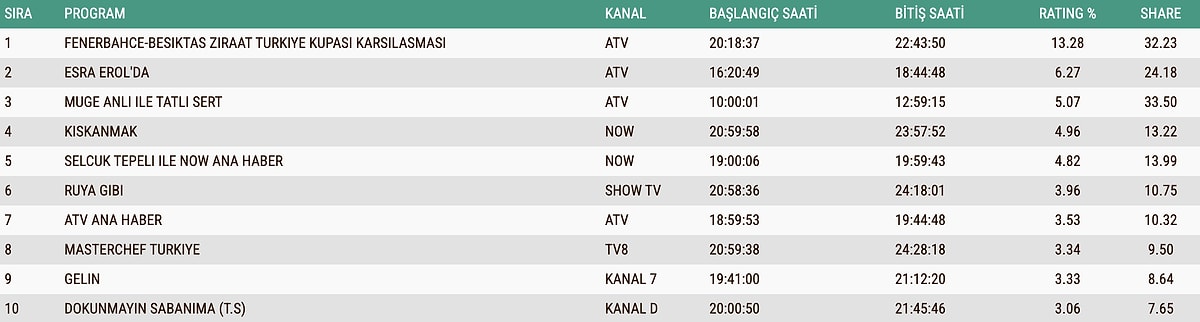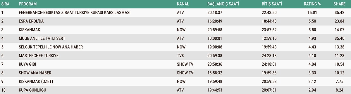 23 ARALIK SALI TOTAL REYTİNG SONUÇLARI