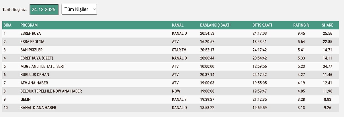 24 ARALIK ÇARŞAMBA TOTAL REYTİNG SONUÇLARI