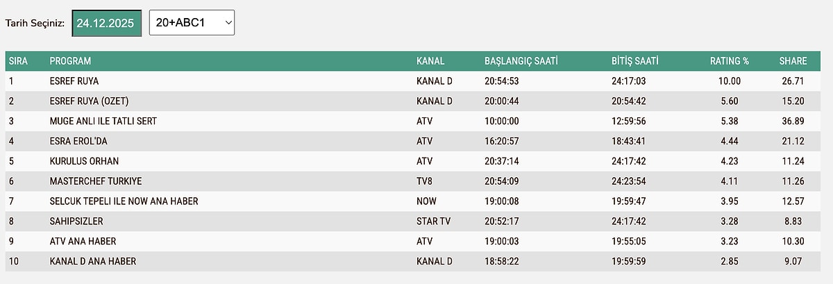 24 ARALIK ÇARŞAMBA ABC1 REYTİNG SONUÇLARI