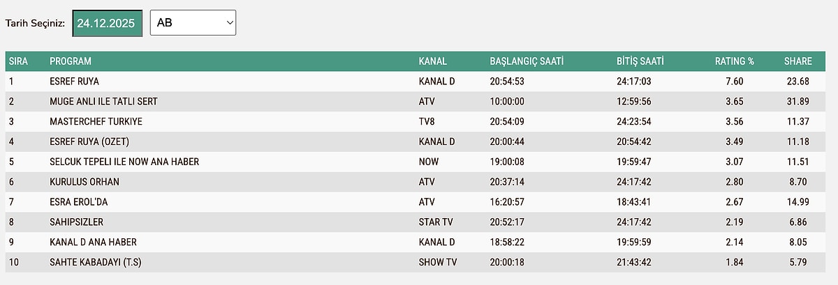 24 ARALIK ÇARŞAMBA AB REYTİNG SONUÇLARI