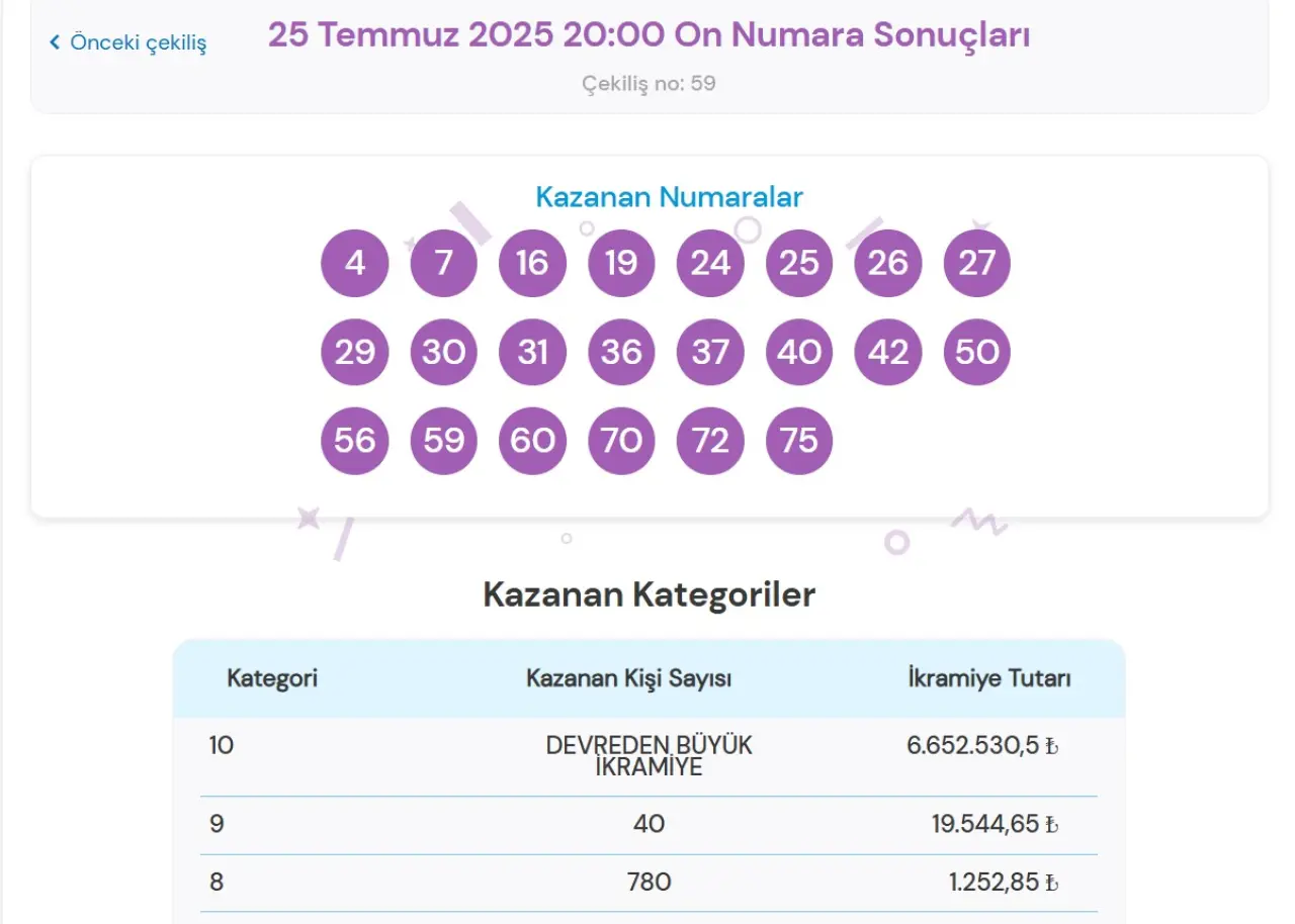 Haftanın 2. ve 2025 yılının da 59. çekilişi olan On Numara’da dağıtılan ikramiyeler şu şekilde duyuruldu: