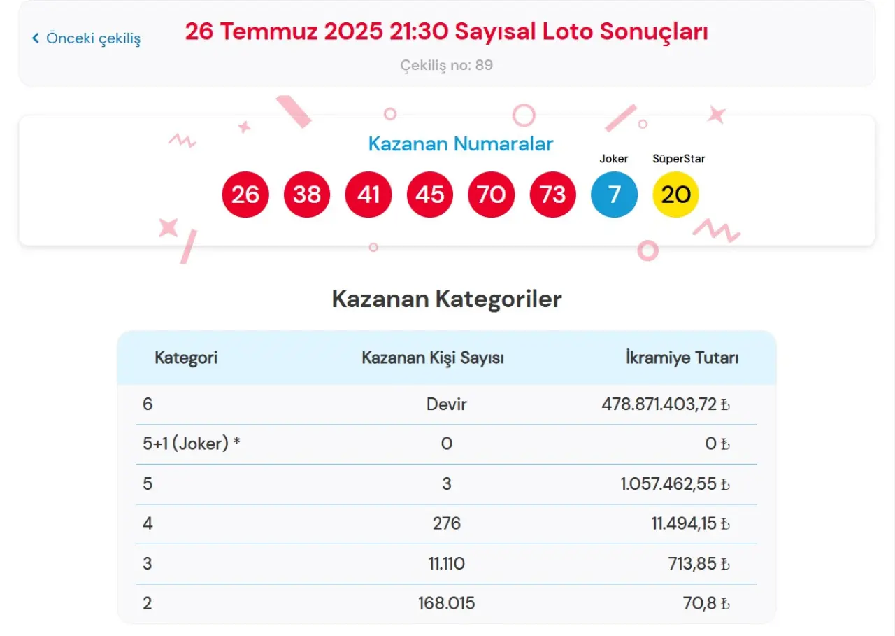 26 Temmuz 2025 Cumartesi akşamı saat 21.30 itibariyle gerçekleştirilen Çılgın Sayısal Loto çekilişinde; 1’den 90’a kadar olan sayılar içerisinden 6 talihli topun yanı sıra, 1 adet Joker sayısı ve 1 adet de Süper Star rakamı belirlendi. Haftalardır devam eden “büyük ikramiye devri” bu çekilişte de sona ermedi. Büyük heyecan sürüyor; işte detaylar…