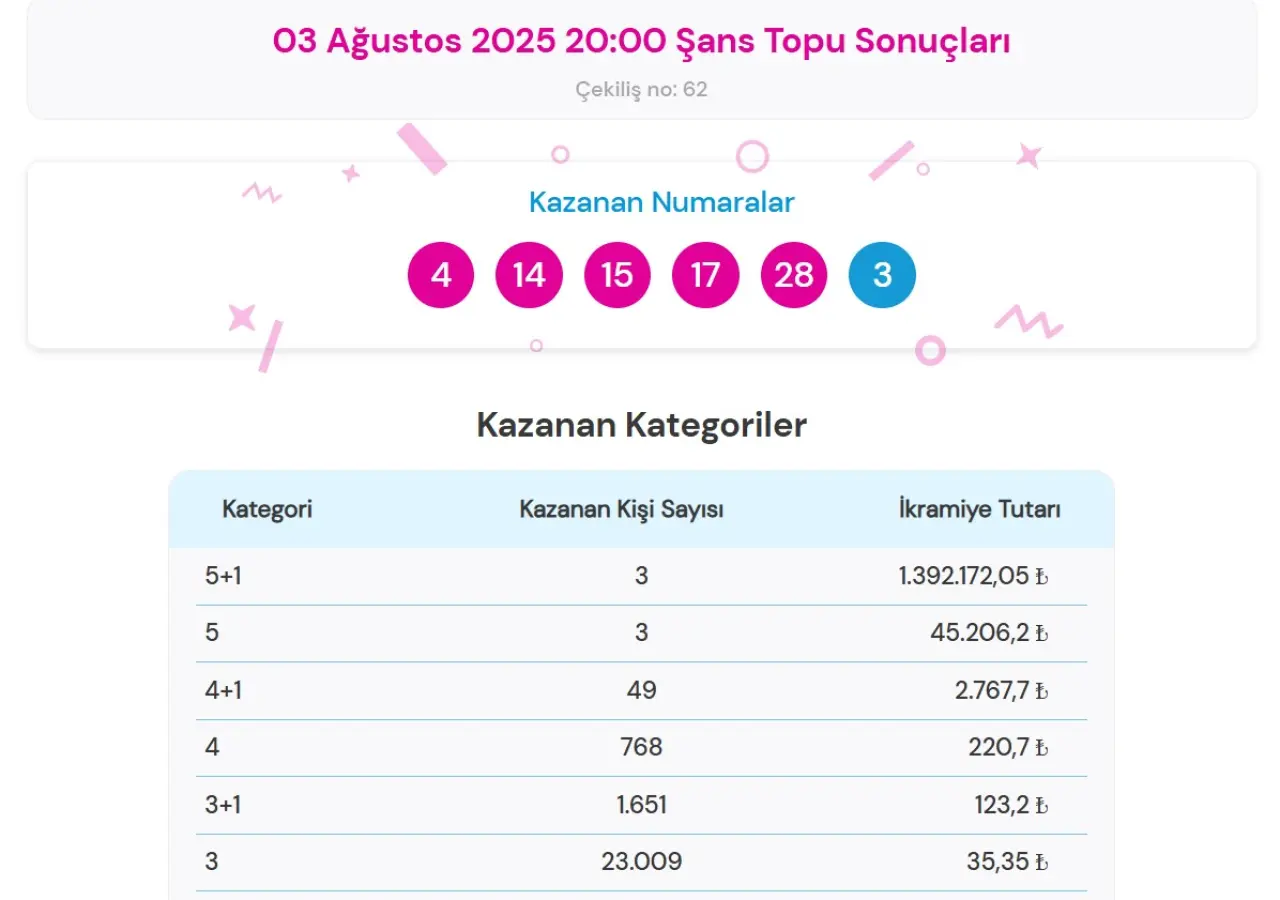 2025 yılının 62., Ağustos ayının ilk ve haftanın da son Şans Topu çekilişi yapıldı. 3 Ağustos 2025 Pazar akşamı saat 20 itibariyle gerçekleştirilen çekilişin sonuçları Milli Piyango İdaresi resmi web sitesinden yayımlandı. Temmuz ayının son çekilişinde devreden büyük ikramiye, geçtiğimiz Çarşamba gününden bu yana birikmeye devam ediyordu. Son 4 günde oynanan kuponlarla birlikte toplam büyük ikramiye rakamı 4 milyon liranın üzerine çıktı. Yeni ayın ilk 5+1 çekilişinde takribi 4 milyon TL’lik ikramiyeyi 3 kişinin bildiği görüldü. Böylece her bir talihli vergiler düşülmeden önce yaklaşık 1,4’er milyon TL’lik para ödülü kazanmış oldu.
