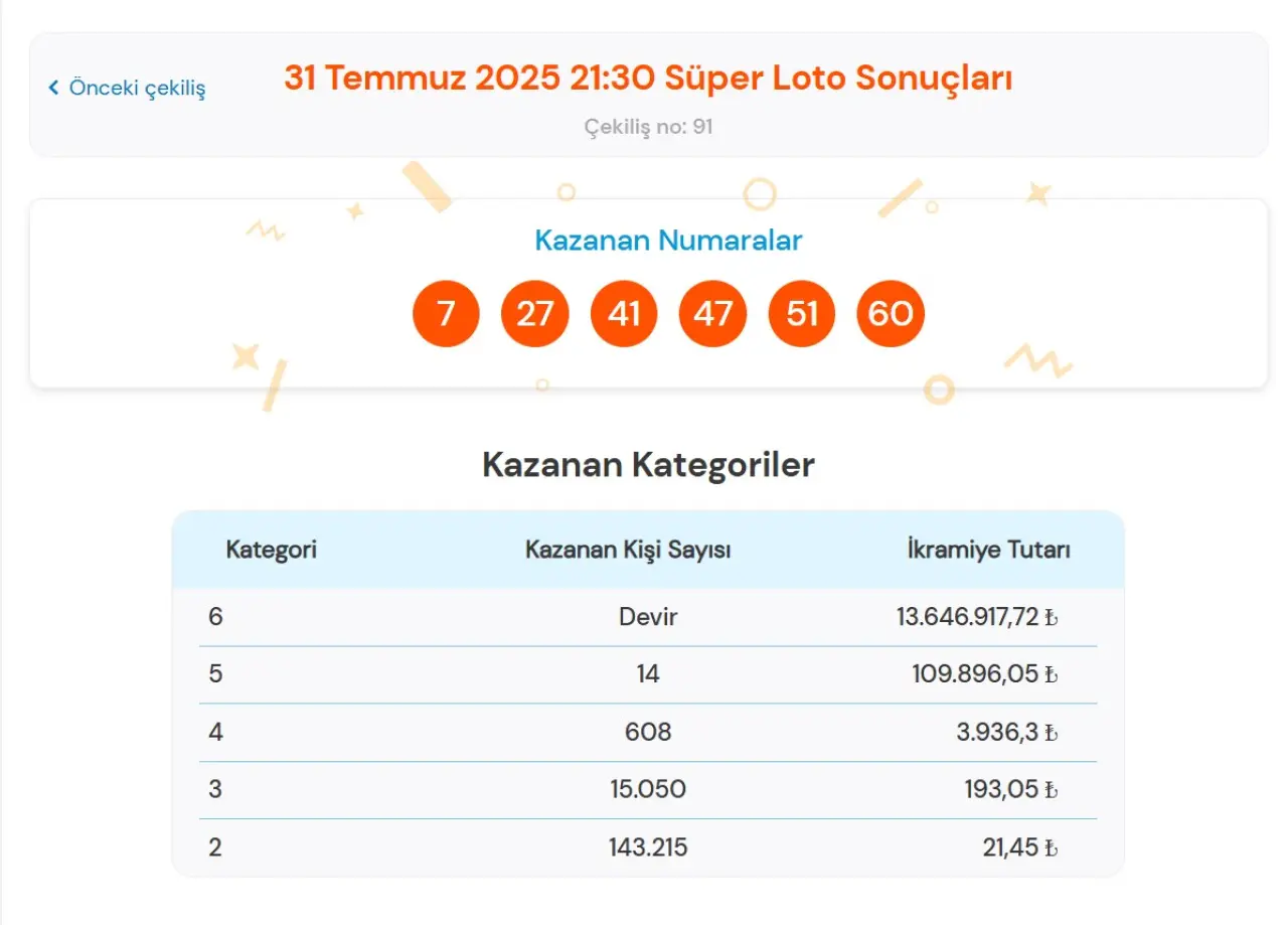 Süper Loto’da 31 Temmuz 2025 Perşembe günü saat 21.30’da yapılan 2025 yılının 91. çekilişinde dağıtılan ikramiyeler şu şekilde oldu: