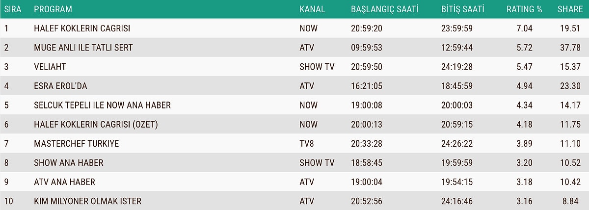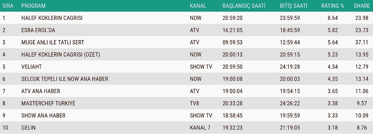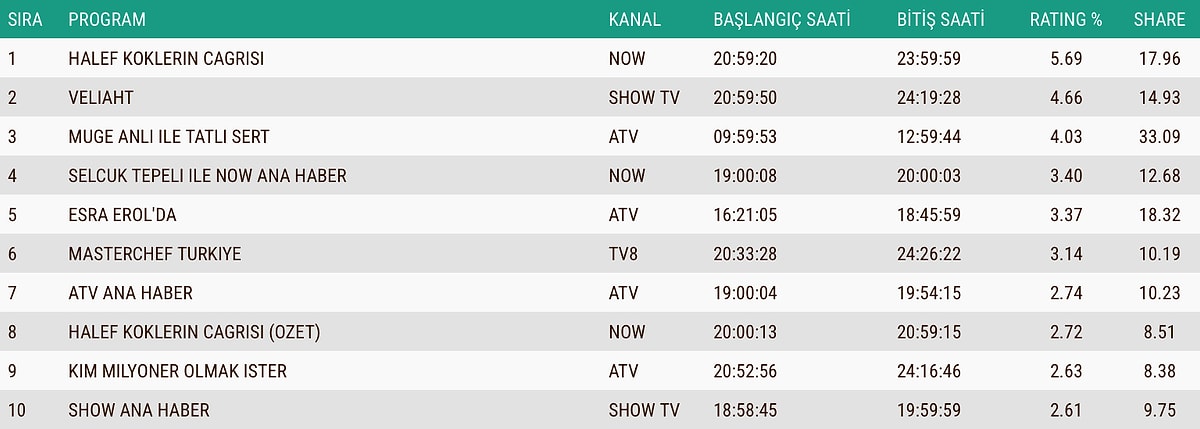 NOW platformunda yayınlanan Halef, hem total hem de AB kategorilerinde birinci sırada yer aldı. Dizinin her hafta olduğu gibi bu hafta da reytinglerde üstün performans göstermesi, aşiret temalı yapımların izleyici kitlesi üzerindeki etkisini bir kez daha ortaya koydu.