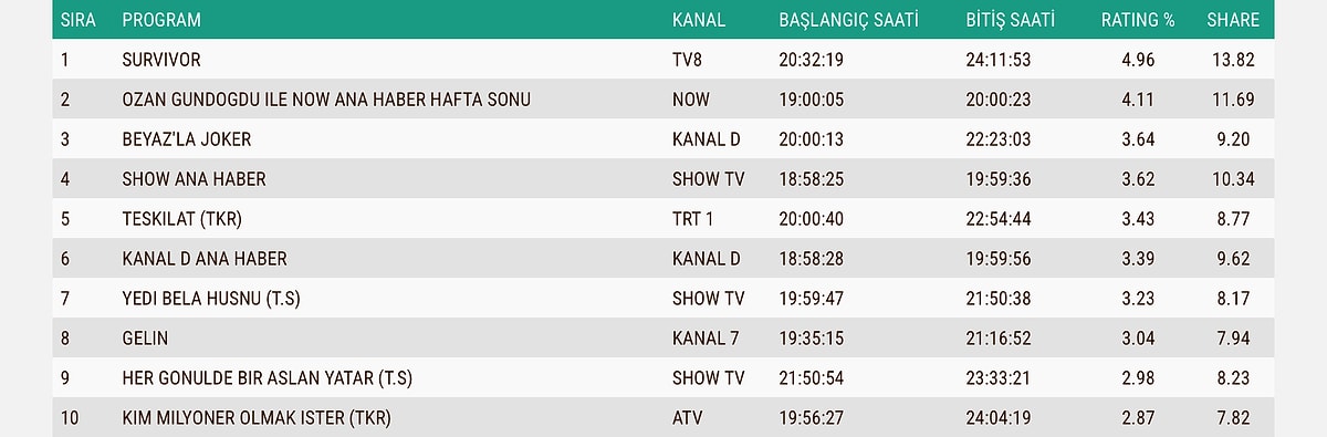 Survivor, bu sezon yeni isimlerle ekrana geldiği için dikkat çeken bölümüyle Total grubunda birinci olurken, Beyaz’la Joker ise AB grubunda zirveye oturdu. İzleyicilerin iki programa da ilgi göstermesi, Pazar akşamının en çok konuşulan televizyon olaylarından biri oldu.