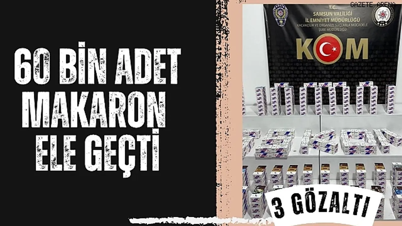 Edinilen bilgiye göre, Samsun Cumhuriyet Başsavcılığı koordinesinde kaçakçılık suçlarıyla mücadele kapsamında çalışma yapan Samsun Emniyet Müdürlüğü Kaçakçılık ve Organize Suçlarla Mücadele (KOM) Şube Müdürlüğü ekipleri, İlkadım ilçesinde operasyon düzenledi. Yapılan aramada 60 bin adet makaron ve 1 adet ruhsatsız tabanca ele geçirildi. Olayla ilgili 3 kişi gözaltına alındı. Soruşturma devam ediyor.