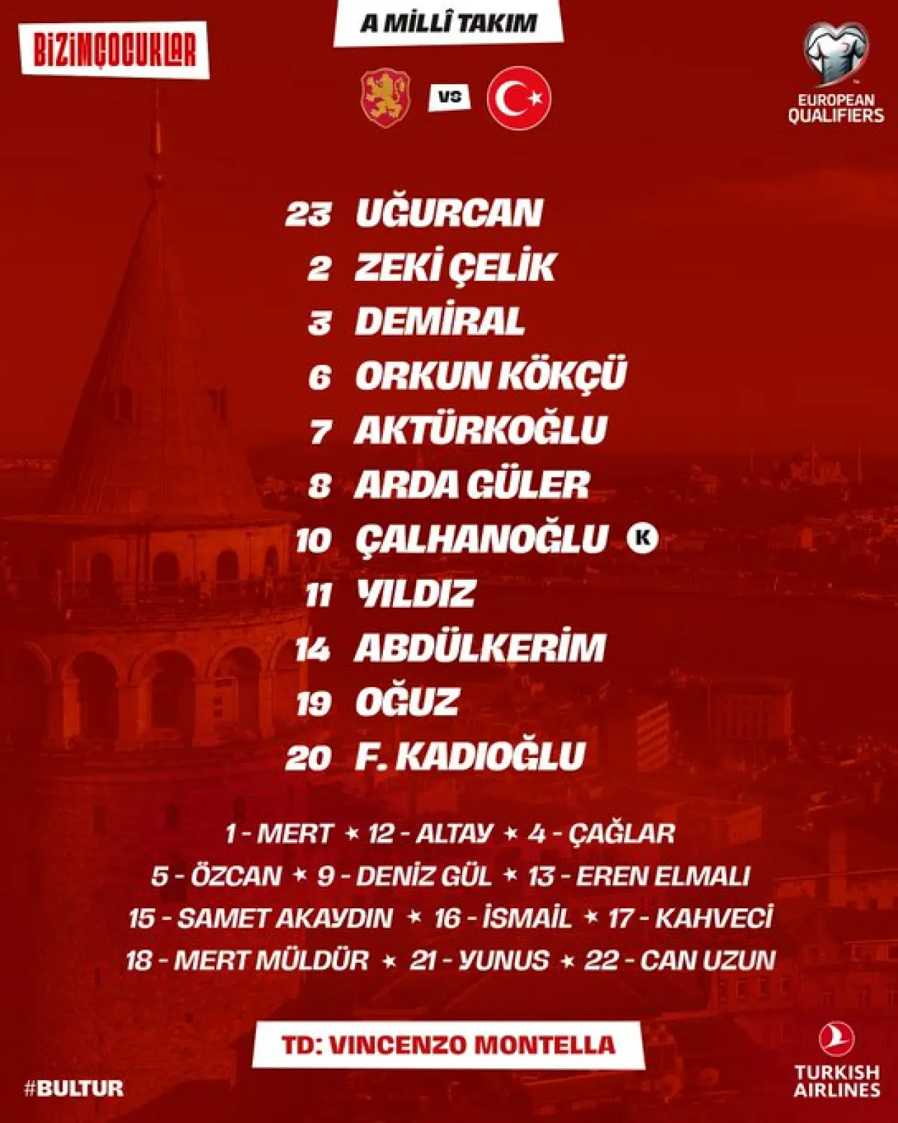A Milli Futbol Takımı, 2026 FIFA Dünya Kupası Avrupa Elemeleri E Grubu üçüncü maçında bugün Bulgaristan’a konuk oluyor. Kritik deplasman öncesi teknik direktör, sahaya çıkacak ilk 11’i belirledi. Ay-Yıldızlılar, Sofya’daki Vasilevski Stadı’nda saat 21.45’te başlayacak mücadelede kazanarak grupta avantaj sağlamayı hedefliyor.