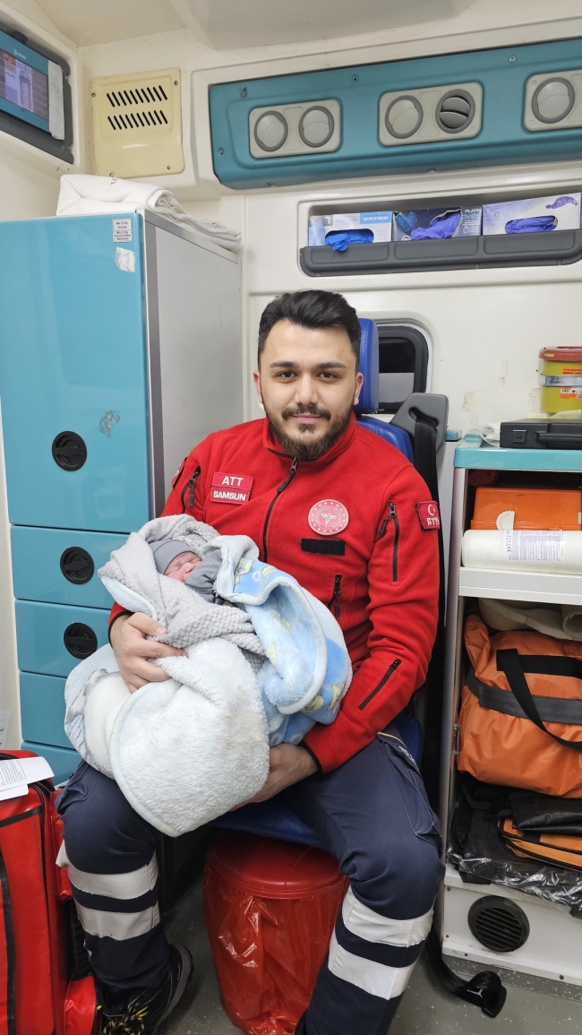 Doğum sancıları artan anne, Samsun Eğitim ve Araştırma Hastanesi'ne yetiştirilmek üzere ambulansa alındı. Ancak yolda doğum gerçekleşti. Ambulansta görevli Ebe Kübranur Taştemur ve ATT Berat Can Akçaoğlu, kordonu boynuna dolanmış bebeğe hızla müdahale ederek, onun sağlıklı bir şekilde dünyaya gelmesini sağladı.