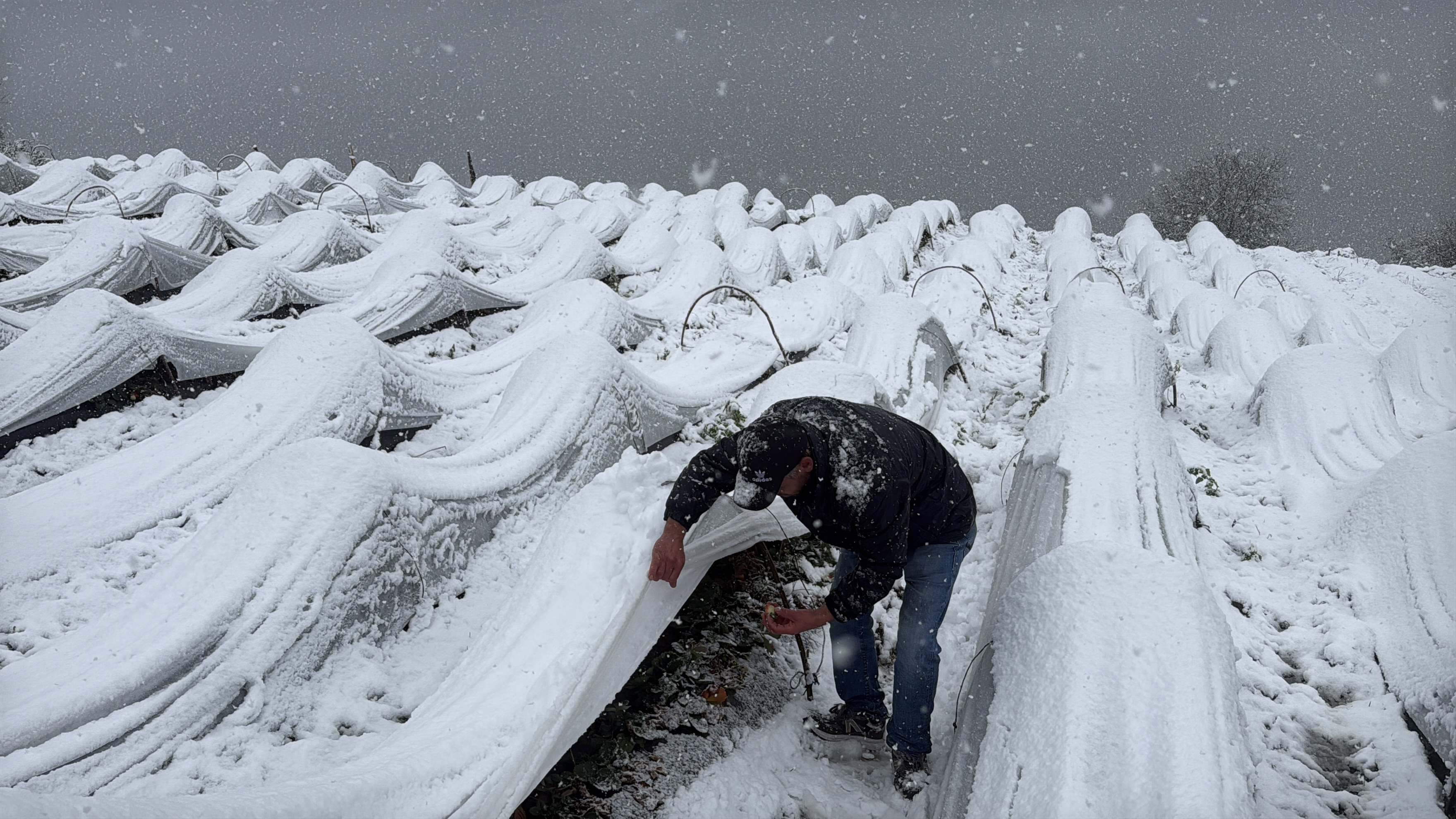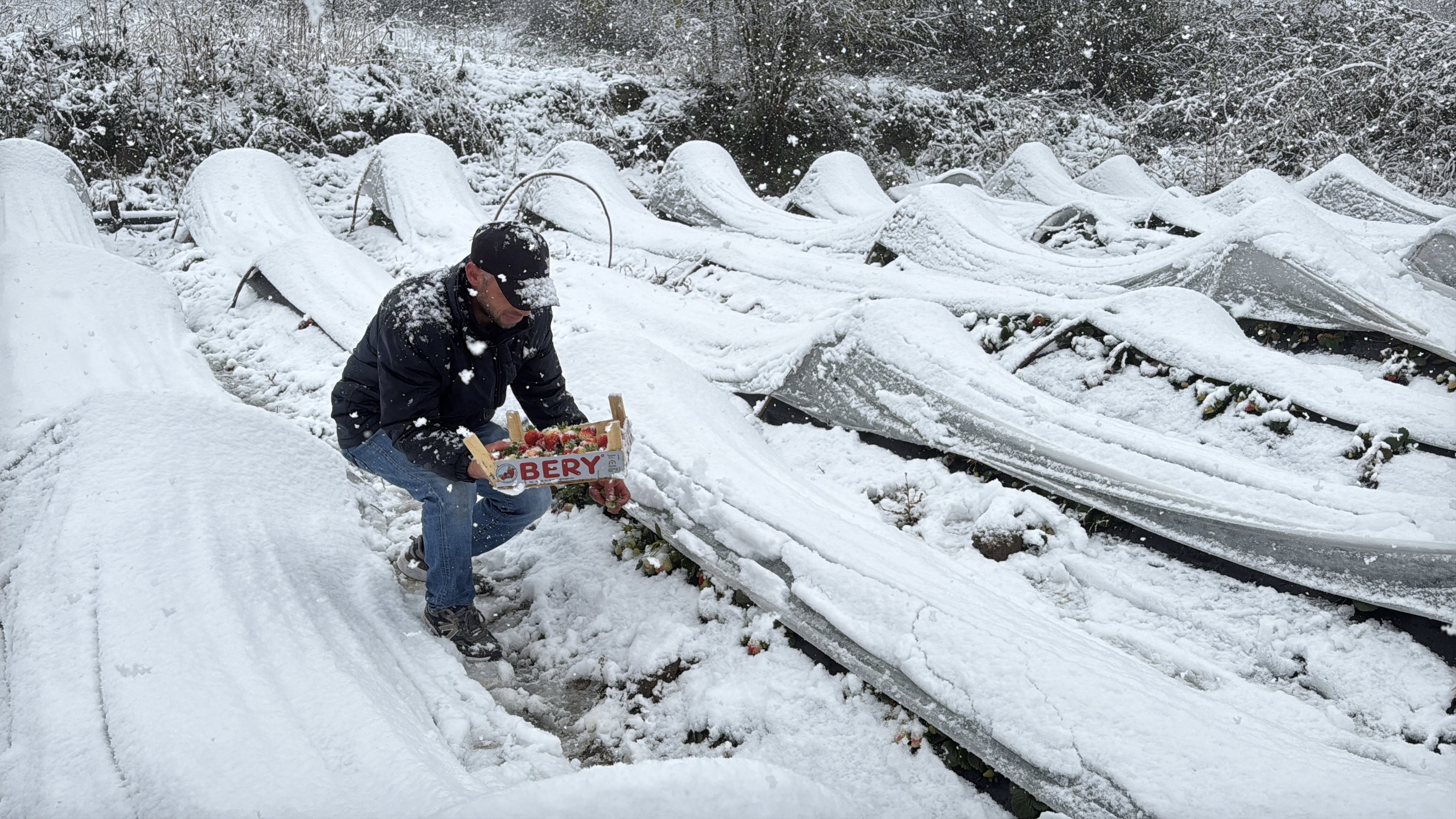 Samsun’un Alaçam ilçesinde yüksek rakımlı bölgelerde etkili olan kar yağışı, örtü altı çilek üreticilerini durduramadı. İlçeye bağlı 1100 rakımlı Vicikler Mahallesi’nde üreticiler, karla kaplı bahçelerinde çilek hasadını sürdürdü.