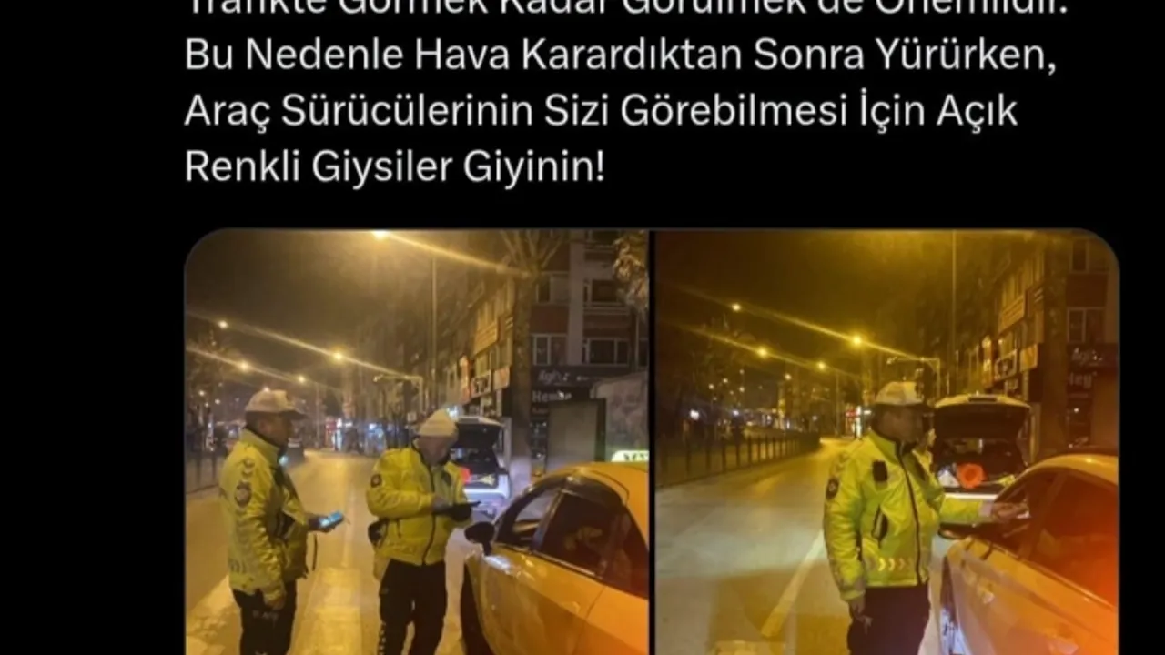Müdürlüğün sosyal medya hesabından yapılan paylaşımda, "Trafikte görmek kadar görülmek de önemlidir. Bu nedenle hava karardıktan sonra yürürken, araç sürücülerinin sizi görebilmesi için açık renkli giysiler giyinin!" ifadeleri kullanıldı.