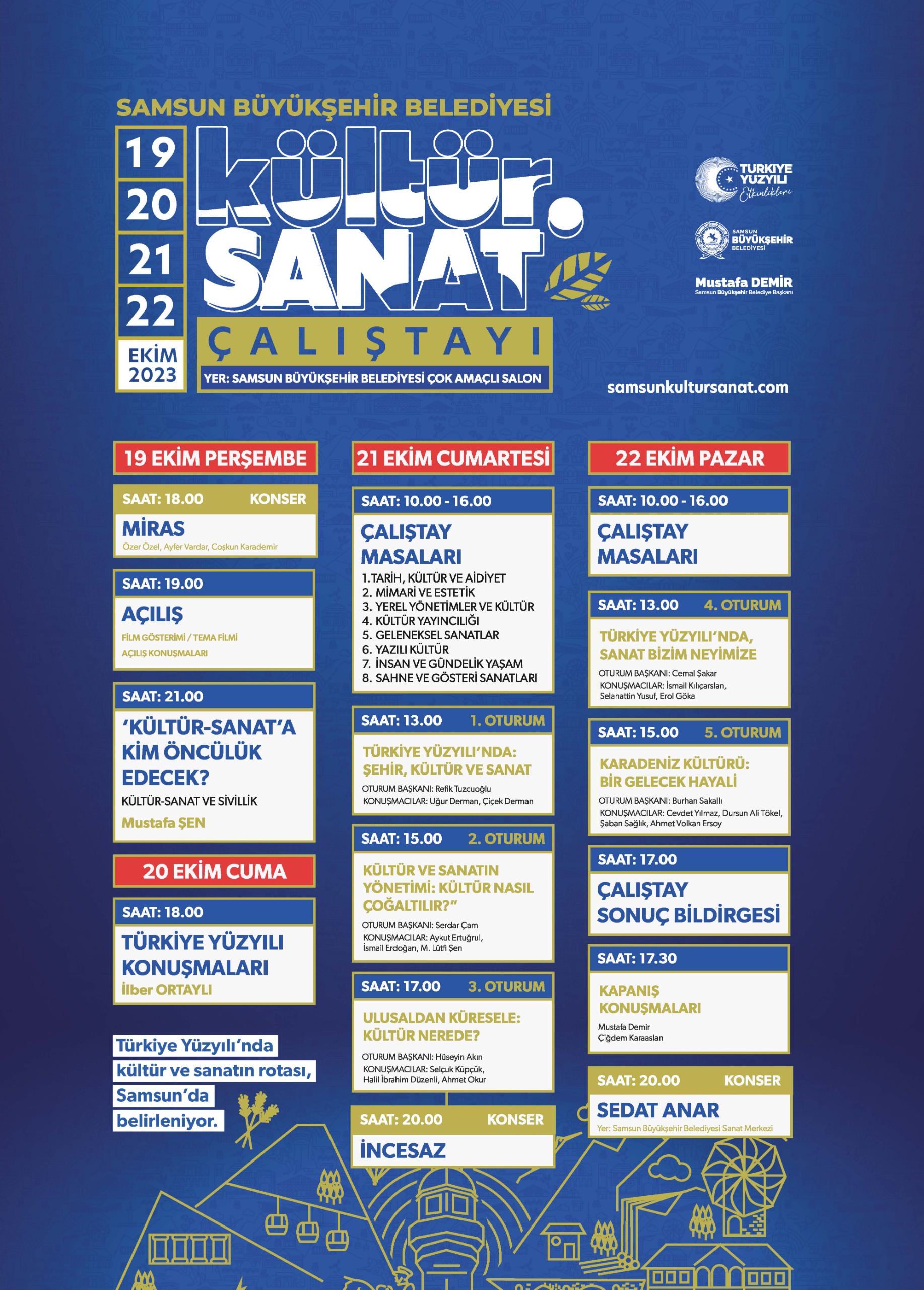 Çalıştayın, Türkiye’nin sanat ve kültür alanında önemli isimlerini Samsun’da bir araya getireceğini belirten Büyükşehir Belediye Başkanı Mustafa Demir, “Türkiye Yüzyılı’nda Kültür ve Sanatın Rotası Samsun’da belirleniyor’ mottosuyla düzenlediğimiz bu organizasyonu kentimiz ve ülkemiz için çok önemsiyoruz. ‘Öncü şehir Samsun’ vizyonuyla kentimizde dev bütçeli yatırımları hayata geçirirken bir yandan da kültür ve sanat alanında öncü organizasyonları düzenliyoruz. Büyükşehir Belediyesi olarak kültür ve sanat faaliyetlerine büyük önem veriyoruz. Sanat ve kültürün her zaman ön planda tutulduğu çalışmaları hayata geçiriyoruz. Kültür ve Sanat Çalıştayı’mız da bu kapsamda düzenlediğimiz çok önemli etkinliklerden birisi. Tüm vatandaşlarımızı bu değerli organizasyona katılmaya davet ediyorum” dedi.