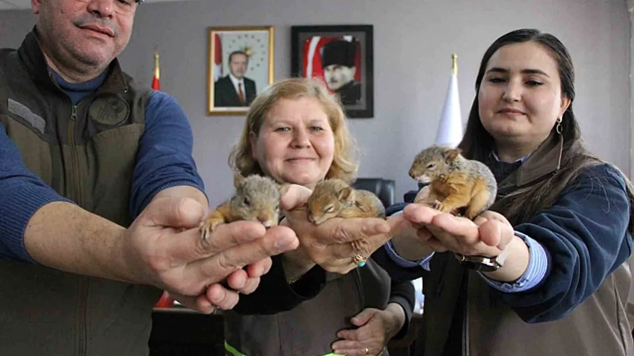 Amasya'da bir vatandaşın bulup teslim ettiği 3 sincap yavrusu, Doğa Koruma ve Milli Parklar Amasya Şubesi görevlileri tarafından özenle beslenip bakılıyor. Annesiz kalan sevimli yavrulara üçer saat arayla şırıngayla süt verilirken bir ay sonra doğal ortamlarına salınması planlanıyor.