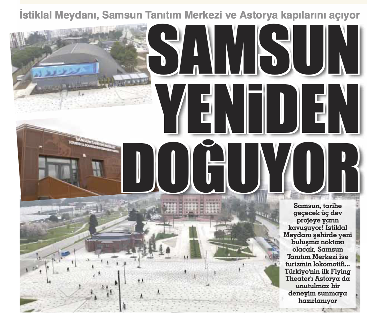 Samsun Büyükşehir Belediyesi tarafından hayata geçirilen üç büyük vizyon projesi de tamamlanarak hizmete açıldı. İstiklal Meydanı, Samsun Tanıtım Merkezi ve Türkiye’de bir ilk olma özelliği taşıyan Astorya, 27 Mart Cuma günü saat 15.00 itibarıyla düzenlenen törenle vatandaşların kullanımına sunuldu. Projelerin kent estetiği ve turizm potansiyeline katkı sağlaması hedefleniyor.