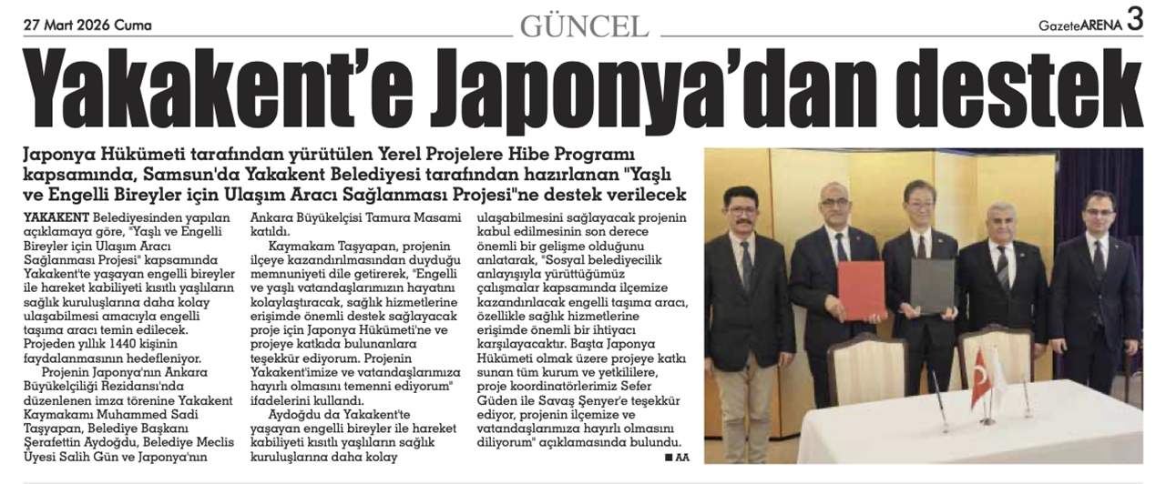 Samsun’a uluslararası destek de gündeme geldi. Yakakent Belediyesi’nin yaşlı ve engelli bireylere yönelik ulaşım projesine Japonya Hükümeti tarafından hibe desteği sağlandı. Sosyal belediyecilik açısından önemli görülen destek, ilçede yaşam kalitesini artıracak.