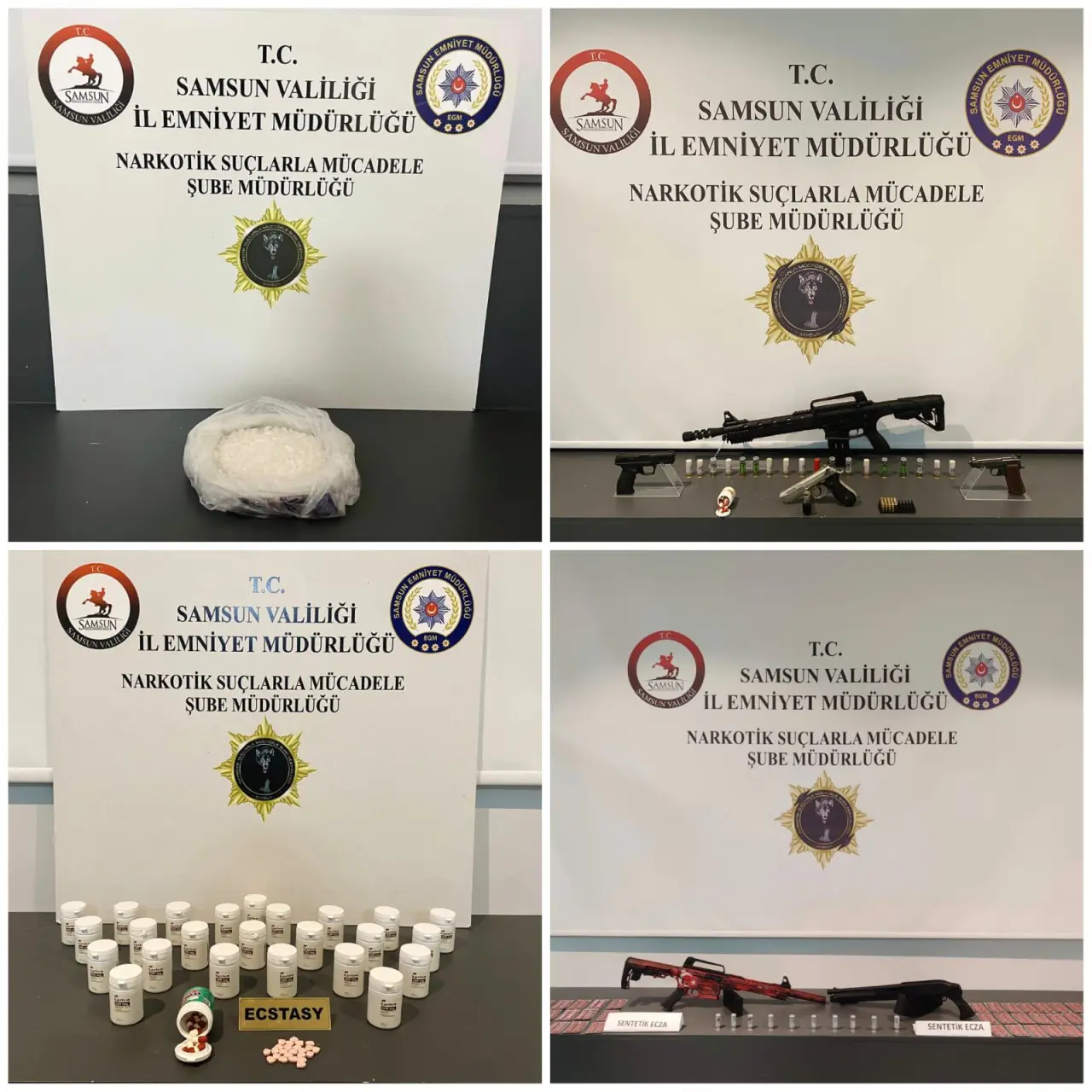Samsun uyuşturucu operasyonu, metamfetamin ele geçirildi, sentetik ecza, Samsun narkotik polis, ruhsatsız silah, İlkadım operasyonu, Atakum uyuşturucu baskını, narkotik şube müdürlüğü, Samsun haber, 2025 uyuşturucu operasyonları