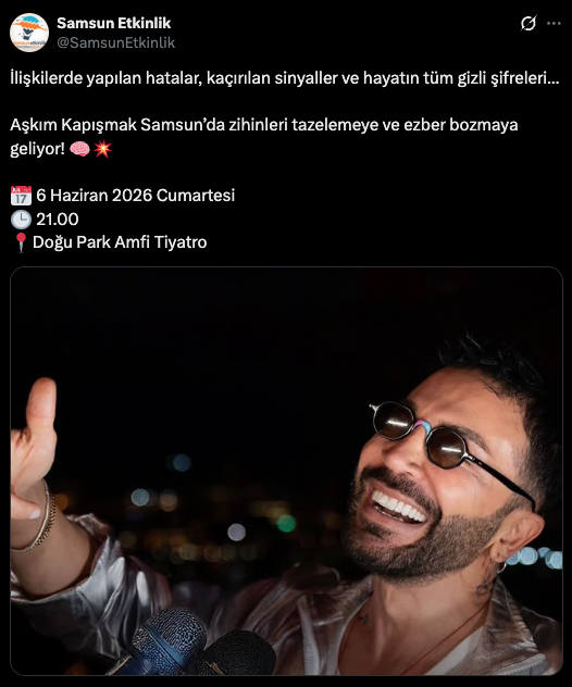 İlişkilerde yapılan hatalar, kaçırılan sinyaller ve hayatın görünmeyen yönleri, Aşkım Kapışmak’ın sahneye taşıdığı özel gösteriyle Samsun’da konuşulacak. Aşkım Kapışmak, 6 Haziran 2026 Cumartesi günü saat 21.00’de Doğu Park Amfi Tiyatro’da izleyicilerle bir araya gelecek.