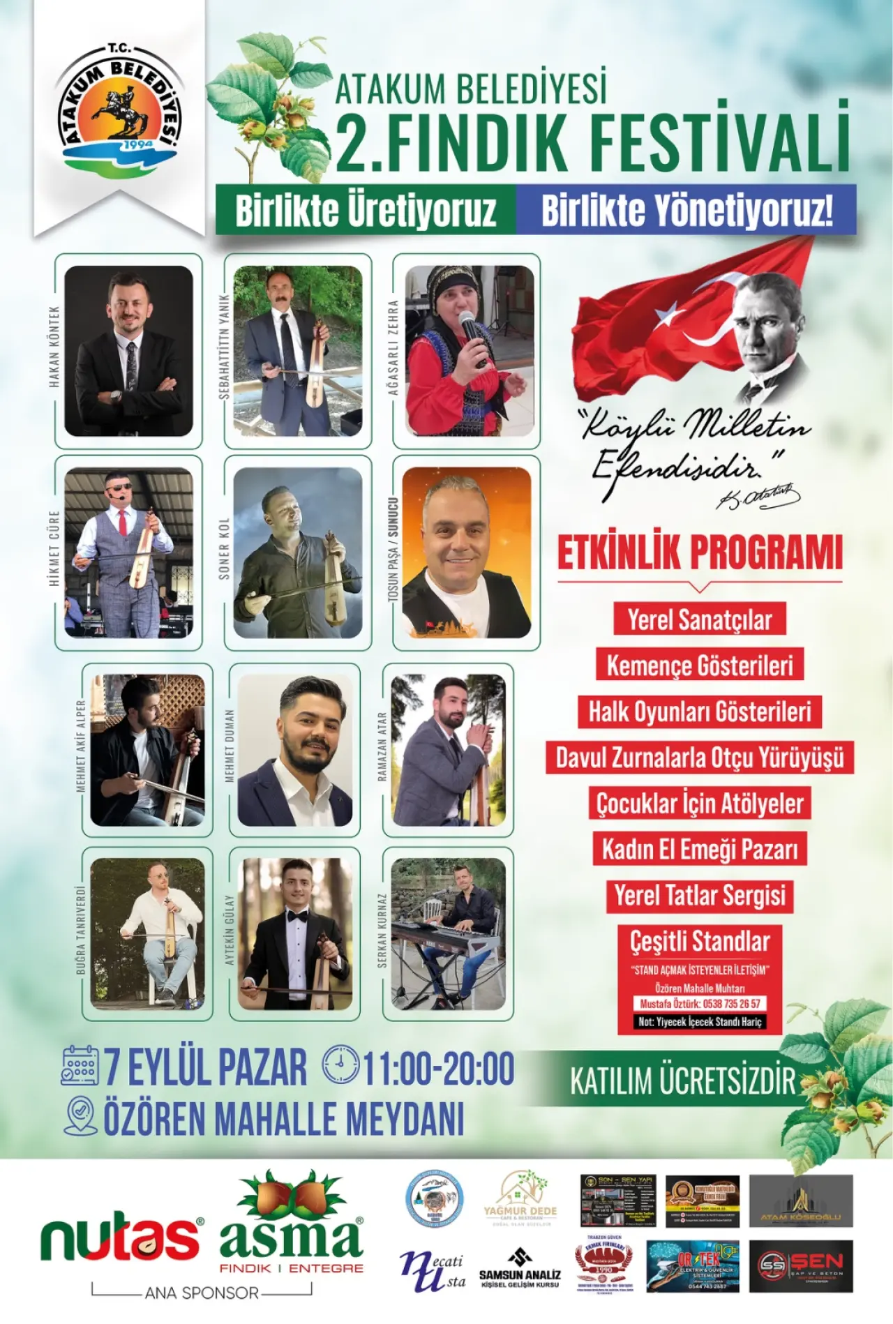 Atakum Belediyesi 2. Geleneksel Fındık Festivali, 7 Eylül Pazar günü 11.00-20.00 saatleri arasında Özören Mahallesi’nde gerçekleştirilecek.