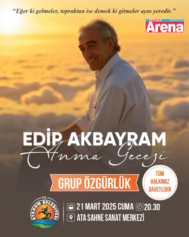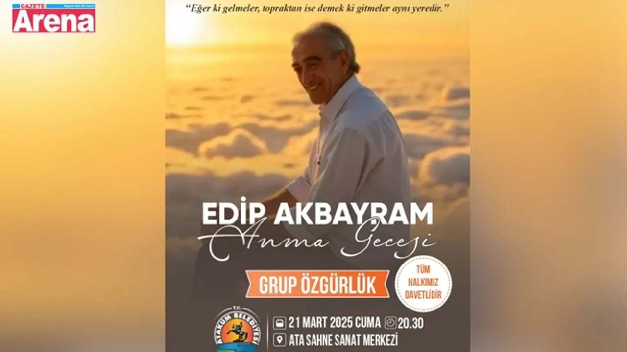 Belediye yetkililerinden yapılan açıklamada, “Güçlü yorumu ve halkın sesi olan şarkılarıyla gönüllerde taht kuran Edip Akbayram’ı, Ata Sahne’de gerçekleştireceğimiz programla anacağız. Grup Özgürlük’ün yorumlarıyla, usta sanatçımızın unutulmaz şarkıları sanatseverlerle buluşacak. Tüm halkımızı bu özel programa davet ediyoruz” denildi.