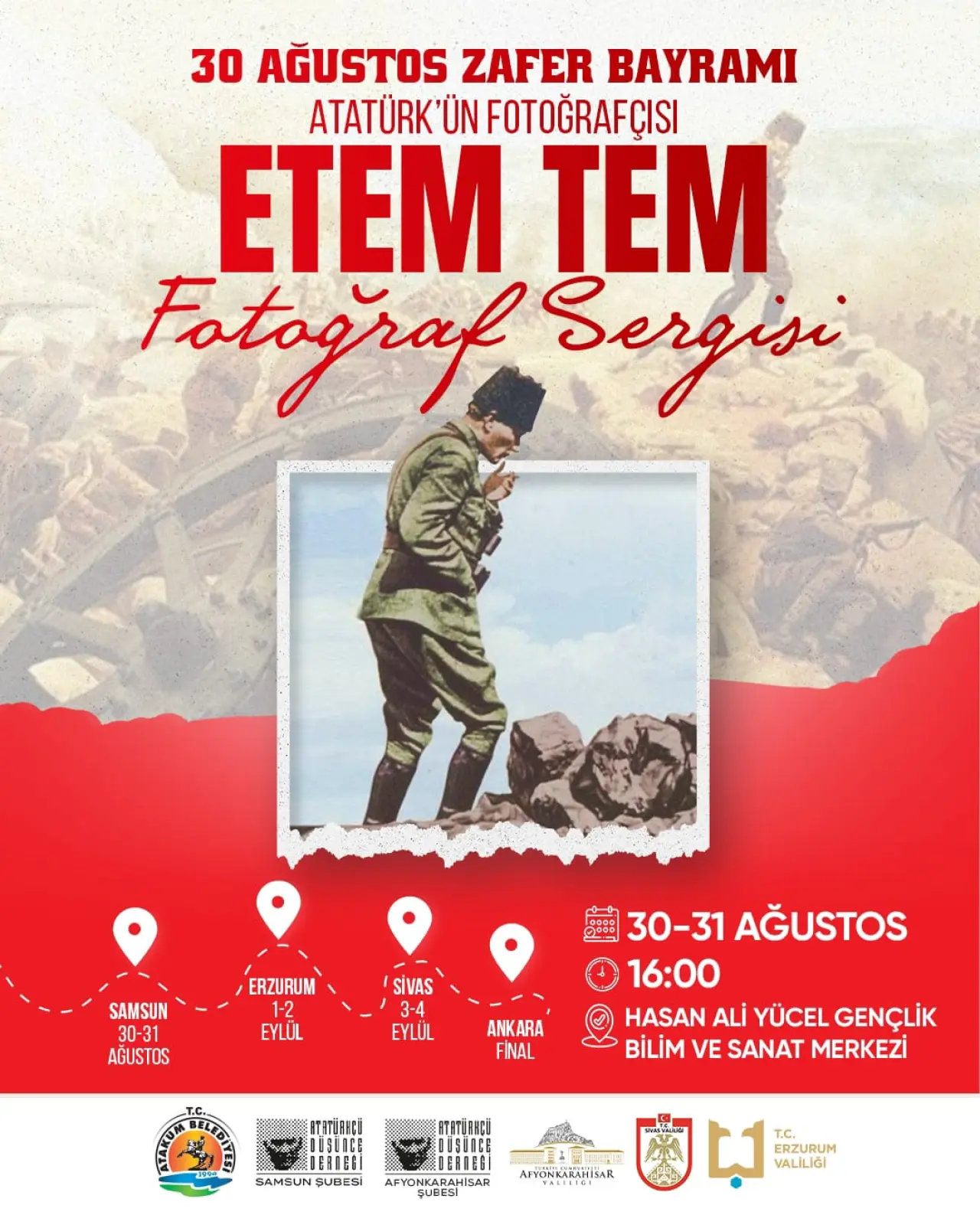 Programın başlangıcını, Kurtuluş Savaşı’ndan önemli karelerin yer aldığı Etem Hamdi Tem’in fotoğraf sergisi oluşturuyor. Sergi, Atakum Belediyesi Hasan Ali Yücel Gençlik Bilim ve Sanat Merkezi’nde ziyarete açılacak. Organizasyon, Atakum Belediyesi ile Atatürkçü Düşünce Derneği (ADD) Samsun Şubesi, Afyonkarahisar ve Sivas Valilikleri ile ADD Afyonkarahisar ve Erzurum Şubeleri iş birliğiyle gerçekleştiriliyor. Sergide, Ulu Önder’in Büyük Taarruz’u başlattığı Kocatepe’de çekilen sembol fotoğraf da yer alacak.