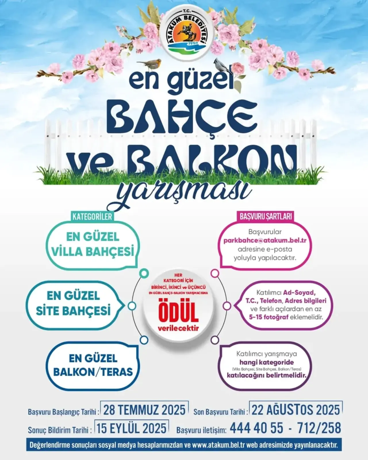 Yarışmaya katılmak isteyen Atakumlular, 22 Ağustos 2025 Cuma gününe kadar başvurularını yapabilecek. Adaylar, yaşam alanlarındaki balkon, teras veya bahçelerinin en güzel hallerini fotoğraflayarak jüriye sunacak.