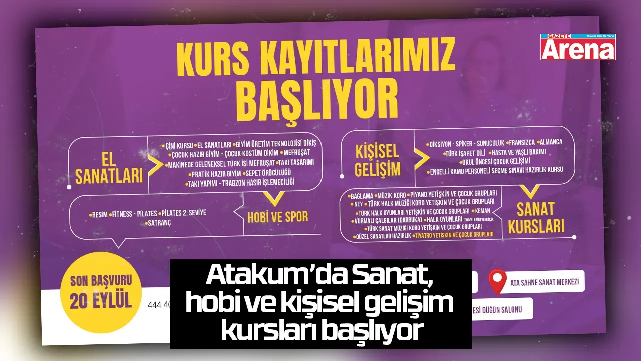 Atakum Belediyesi ile Atakum Halk Eğitim Merkezi Müdürlüğü iş birliğiyle organize edilen kurslar, el sanatları, kişisel gelişim, sanat, hobi ve spor alanlarında gerçekleştirilecek. Her kurs, alanında uzman eğitmenler tarafından yönetilecek ve katılımcıların yeteneklerini geliştirmelerine fırsat sunacak.