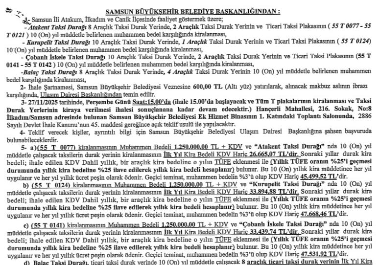 27 Kasım Perşembe günü saat 15.00'da yapılacak ihalenin şartnamesinde, plakaların 1 milyon 250 bin TL muhammen bedel üzerinden on yıllığına kiraya verileceği açıklandı. İki yıllığına kiraya verilecek taksi durak fiyatları ise şu şekilde belirtildi: Atakent Taksi Durağı 26 bin 665 TL, Kurupelit Taksi Durağı 33 bin 894 TL, Çobanlı İskele Taksi Durağı 33 bin 439 TL, Balaç Taksi Durağı 15 bin 53 TL. Öte yandan her taksi durağının kendi harcamalarında kullanılmak üzere bir kereye mahsus olmak üzere 300 bin TL civarında hava parası istendiği de öğrenildi.
