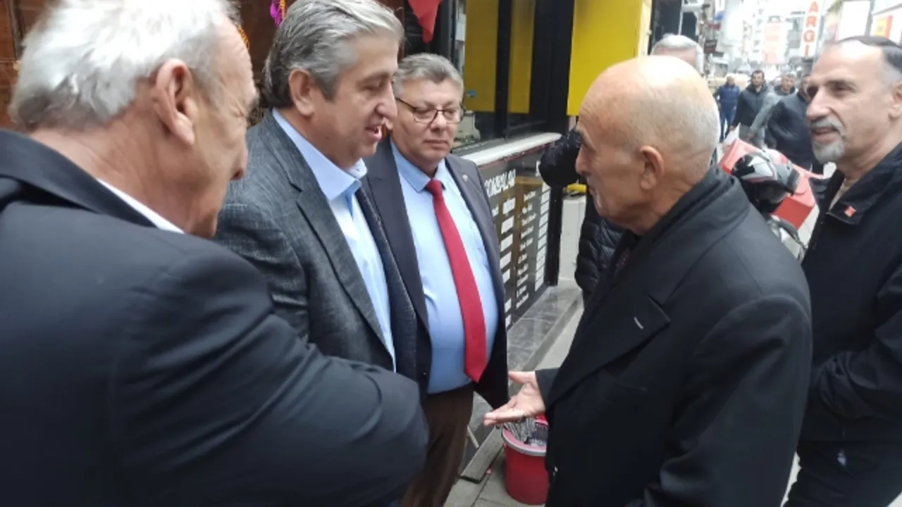Çarsamba'da ülkücü camianın duayen kişilerinden olan emekli eğitimci Necmi Pişkin, bir cenaze töreninden dönerken, cenaze törenine katılan ve  esnaf ziyaretleri gerçekleştiren Cumhuriyet Halk Partisi Samsun Milletvekili Murat Can ile karşılaştı.