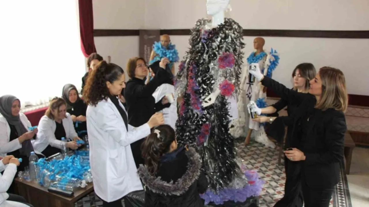 Atık pet şişelerin ve kullanılmış galoşların toplanıp sanat eserine dönüştürüldüğü çalışmanın bir ayda tamamlandığını belirten Elif Kılıç, "Moda, bulunduğu yüzyılın sorunlarını yansıtan bir yapıya sahip. Özellikle iklim değişikliği günümüzün ve gelecek yüzyılın en büyük problemlerinde biri. Bu konuda tüm kadınların desteğine ihtiyacımız olduğuna dikkat çekip davranış değişikliği sağlamak için bu projeyi gerçekleştirdik" dedi.