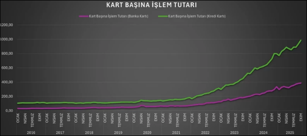 Bankalar arası Kart Merkezi (BKM) verileri, AVM ve market harcamalarındaki artışın gelir artışının gerisinde kaldığını ortaya koyuyor. 2016 yılında banka kartıyla işlem başına yapılan harcama 31 TL iken, 2025 Ekim ayında bu tutar 387 TL’ye yükseldi. Kredi kartlarında ise aynı dönemde işlem başına harcama 104 TL’den 986 TL’ye çıktı.