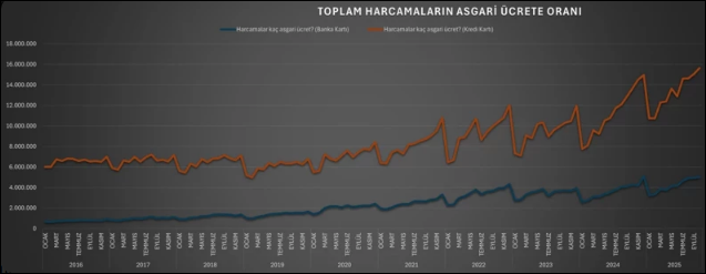 Toplam harcama tutarları nominal olarak artmış olsa da asgari ücretle kıyaslandığında tablo değişiyor. 2016’dan 2025’e asgari ücret yüzde 1599 oranında artarken, işlem başına harcamalardaki artış banka kartında yüzde 1144, kredi kartında ise yüzde 848’de kaldı. Bu fark, tüketicinin harcama gücünün reel olarak zayıfladığını gösteriyor.