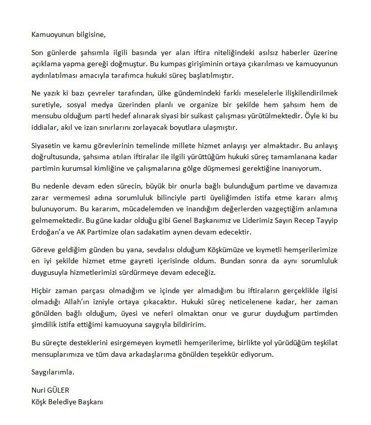 "Göreve geldiğim günden bu yana, sevdalısı olduğum Köşkümüze ve kıymetli hemşerilerimize en iyi şekilde hizmet etme gayreti içerisinde oldum. Bundan sonra da aynı sorumluluk duygusuyla hizmetlerimizi sürdürmeye devam edecegiz. Hiçbir zaman parçası olmadığım ve içinde yer almadığım bu iftiraların gerçeklikle ilgisi olmadığı Allah'ın izniyle ortaya çıkacaktır. Hukuki süreç neticelenene kadar, her zaman gönülden bağlı olduğum, üyesi ve neferi olmaktan onur ve gurur duyduğum partimden şimdilik istifa ettiğimi kamuoyuna saygıyla bildiririm. Bu süreçte desteklerini esirgemeyen kıymetli hemşerilerime, birlikte yol yürüdüğüm teşkilat mensuplarımıza ve tüm dava arkadaşlarıma gönülden teşekkür ediyorum."