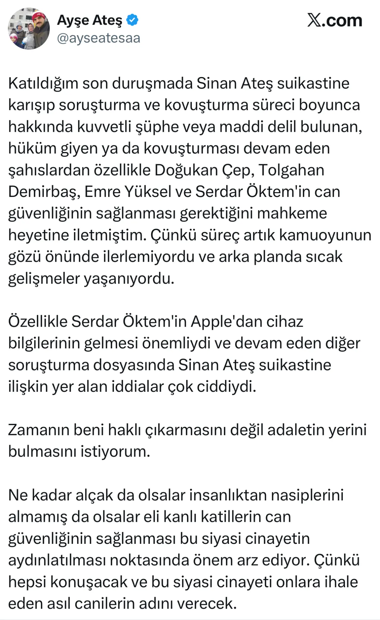 “Katıldığım son duruşmada Sinan Ateş suikastine karışıp soruşturma ve kovuşturma süreci boyunca hakkında kuvvetli şüphe veya maddi delil bulunan, hüküm giyen ya da kovuşturması devam eden şahıslardan özellikle Doğukan Çep, Tolgahan Demirbaş, Emre Yüksel ve Serdar Öktem'in can güvenliğinin sağlanması gerektiğini mahkeme heyetine iletmiştim. Çünkü süreç artık kamuoyunun gözü önünde ilerlemiyordu ve arka planda sıcak gelişmeler yaşanıyordu. Özellikle Serdar Öktem'in Apple'dan cihaz bilgilerinin gelmesi önemliydi ve devam eden diğer soruşturma dosyasında Sinan Ateş suikastine ilişkin yer alan iddialar çok ciddiydi. Zamanın beni haklı çıkarmasını değil adaletin yerini bulmasını istiyorum. Ne kadar alçak da olsalar insanlıktan nasiplerini almamış da olsalar eli kanlı katillerin can güvenliğinin sağlanması bu siyasi cinayetin aydınlatılması noktasında önem arz ediyor. Çünkü hepsi konuşacak ve bu siyasi cinayeti onlara ihale eden asıl canilerin adını verecek.” ifadelerini kullandı.