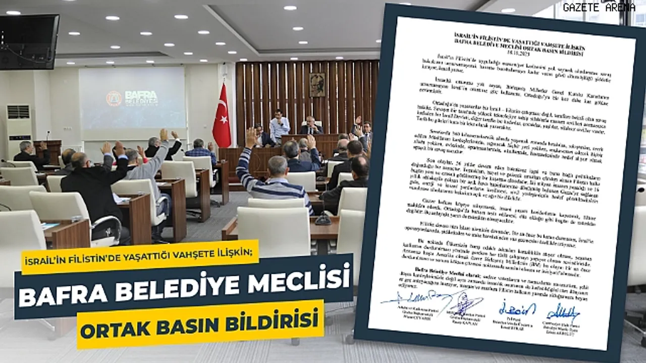 Bafra Belediyesi Meclisinin ortak basın bildirisinde şu ifadelere yer verildi."İsrail’in Filistin’de uyguladığı masumiyet karinesini yok sayarak uluslararası savaş hukukunu umursamayarak hastane bombalamaya kadar varan gözü dönmüşlüğü şiddetle kınıyor, lanetliyoruz.