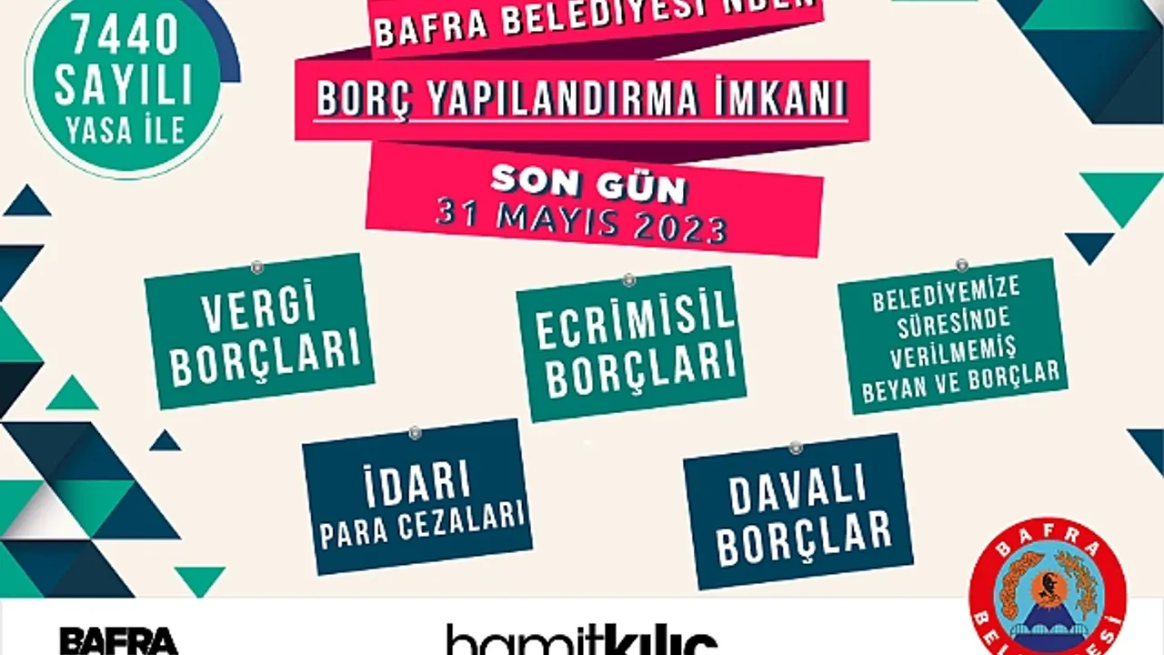 Vatandaşlar 31 Mayıs 2023 tarihine kadar bu yapılandırma fırsatından yararlanarak birikmiş borçlarını yapılandırabilecek ve ödemede kolaylık yaşayacak. Borçlarını yapılandırmak isteyen vatandaşlar Bafra Belediyesi ana binasında bulunan tahsilat veznelerinden ve www.bafra.bel.tr internet sitesi ana sayfasında yer alan “Borç Yapılandırma” sekmesinden işlemlerini gerçekleştirebilecek.