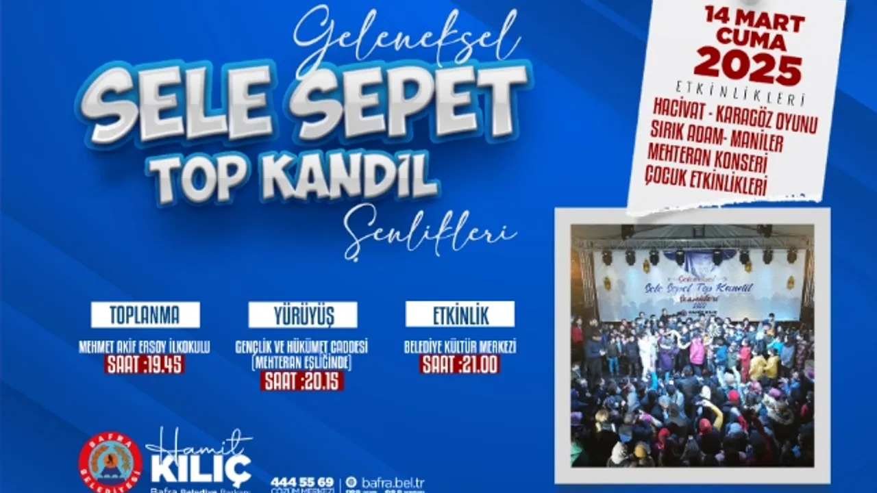 Bafra Belediye Başkanı Hamit Kılıç, “Ramazan ayı içerisinde gerçekleştirdiğimiz Bafra’mızın 600 yıllık geleneğini bu yıl da çocuklarımız ve vatandaşlarımız ile kutlamak için sabırsızlanıyoruz. 14 Mart Cuma günü saat 19.45’de Mehmet Akif Ersoy İlkokulu önünde toplanacağız. Ardından Mehteran takımı eşliğinde belirlenen güzergahlarda yürüyüşümüzü coşkulu bir şekilde gerçekleştirip Belediye Kültür Merkezi’nde hazırlanan etkinlikleri izleyeceğiz. Bu yıl da Bafra’mız rengarenk gösterilere şahitlik edecek, çocuklarımızın dillerindeki eşsiz manilerle gecemiz şenlenecek. Ramazan ayında Bafra’mızın en sevilen akşamı Sele Sepet Top Kandil Şenlikleri’ne tüm hemşehrilerimizi ve kıymetli evlatlarımızı davet ediyorum” dedi.