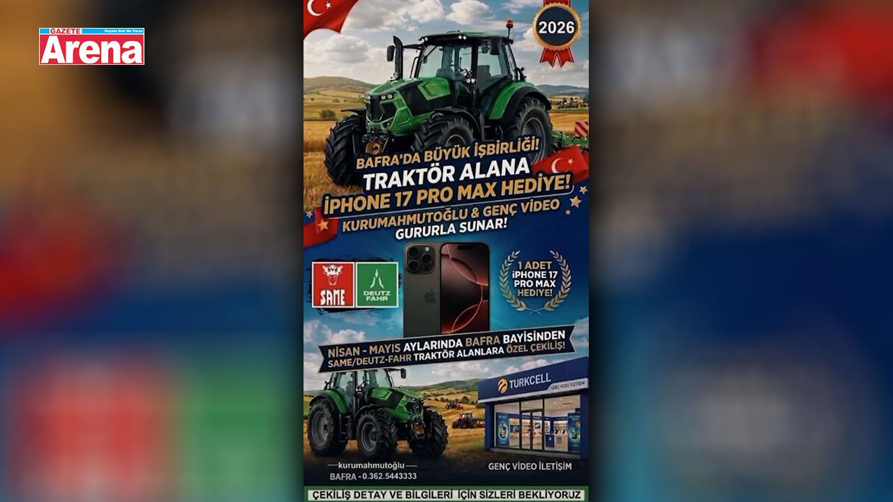 Bafra’da faaliyet gösteren Kurumahmutoğlu ve Genç Video, tarım sektöründe bir iş birliğine imza attı. Nisan ve Mayıs aylarını kapsayan kampanya dahilinde, Bafra bayisinden traktör satın alan çiftçilere özel çekilişle son model iPhone 17 Pro Max hediye edilecek.