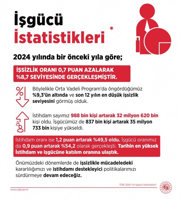 - 2024 yılı itibarıyla istihdam edilen kişi sayısı 988 bin kişi artarak 32 milyon 620 bine yükseldi.