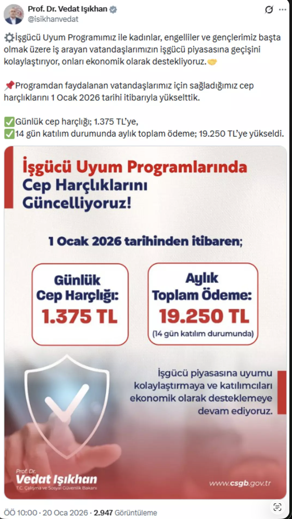 “İşgücü Uyum Programımız ile kadınlar, engelliler ve gençlerimiz başta olmak üzere iş arayan vatandaşlarımızın işgücü piyasasına geçişini kolaylaştırıyor, onları ekonomik olarak destekliyoruz. Programdan faydalanan vatandaşlarımız için sağladığımız cep harçlıklarını 1 Ocak 2026 tarihi itibarıyla yükselttik. Günlük cep harçlığı; 1.375 TL’ye,